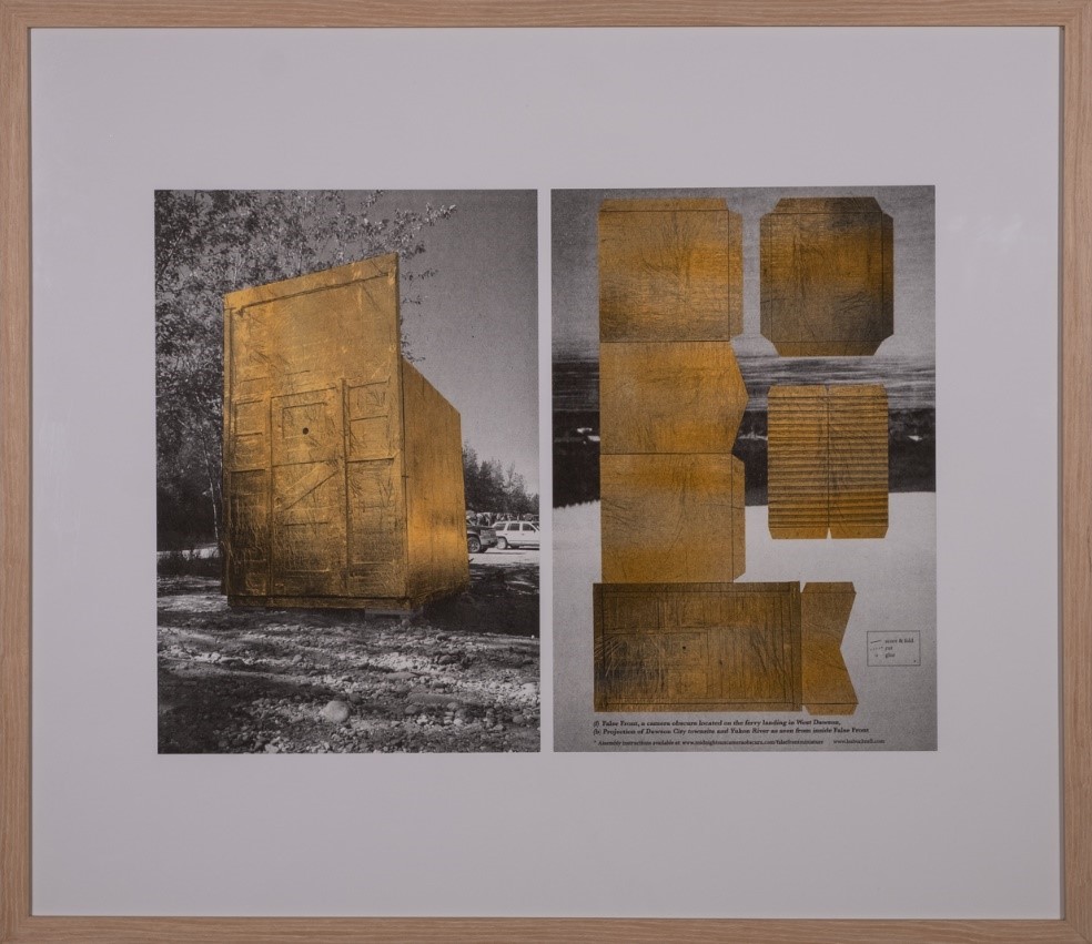Inside, viewers saw an inverted projection of the Yukon River, the townsite, and its surrounding landscape. The original sculpture was purchased by a private resident in Dawson City. When the Kamloops Art Gallery presented the exhibition Midnight Sun Camera Obscura in 2016, a replica of the False Front door was shown alongside images of the original sculpture. This two-sided risograph poster was created for subsequent travelling exhibitions of the Midnight Sun Camera Obscura Project shown at the Klondike Art Gallery, Whitehorse, Yukon; the University of Lethbridge Art Gallery, Lethbridge, Alberta; and McMaster Art Gallery, Hamilton, Ontario and it is now part of the Royal Inland Hospital Foundation’s collection.