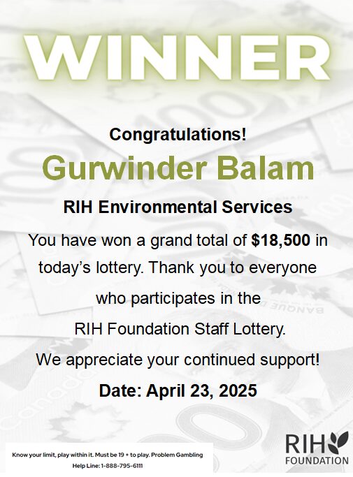 IH employees can sign-up to have $5.00 per entry deducted through Interior Health Payroll for a chance to win the Staff 50/50 Lottery! Each payday, a deduction is made from your pay. Half of this contribution is used to support healthcare at RIH and the other half is placed in the prize pool. 100% of the prize pool is awarded to the winner.