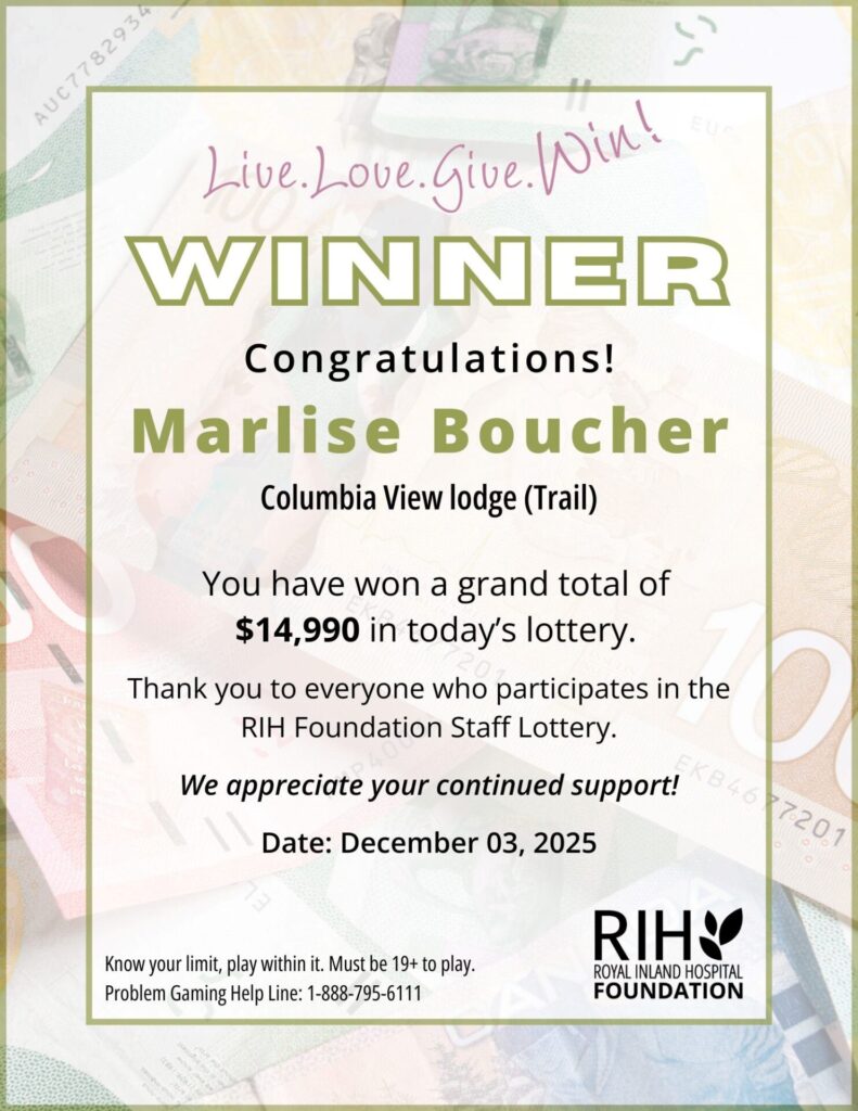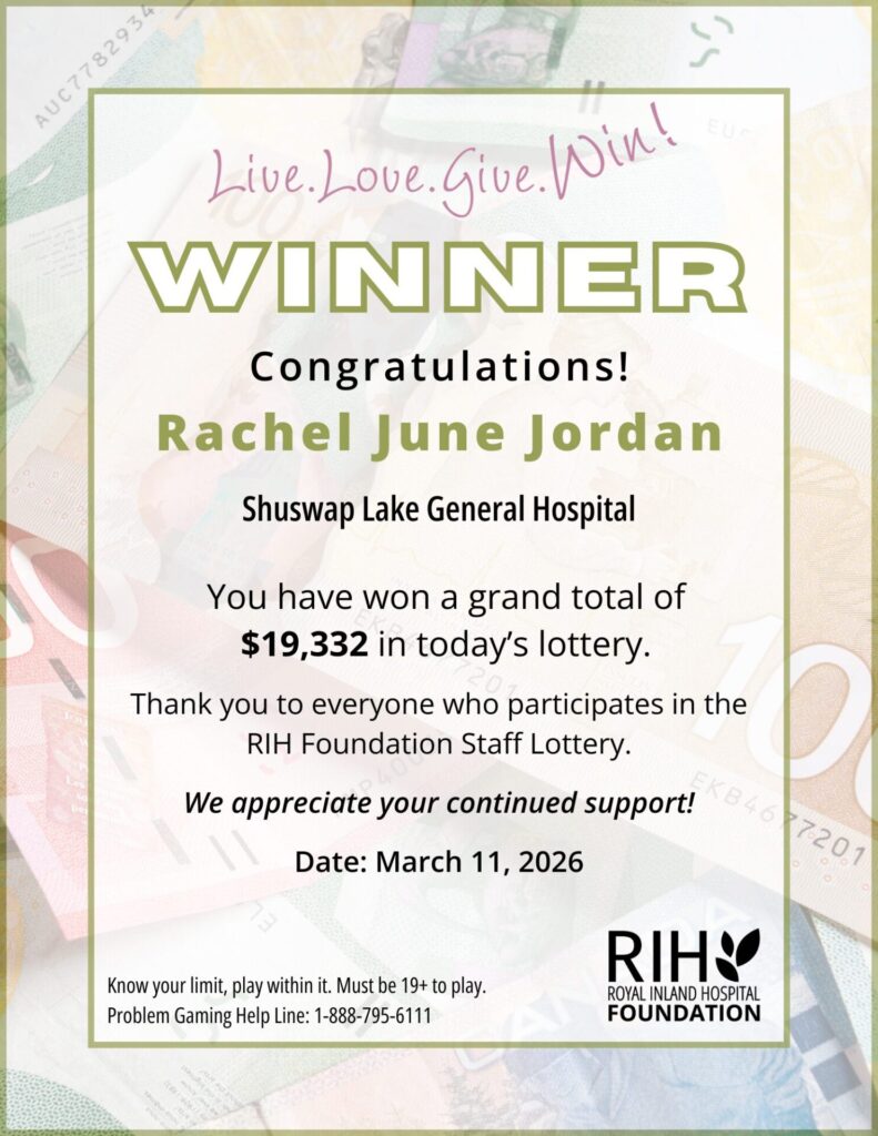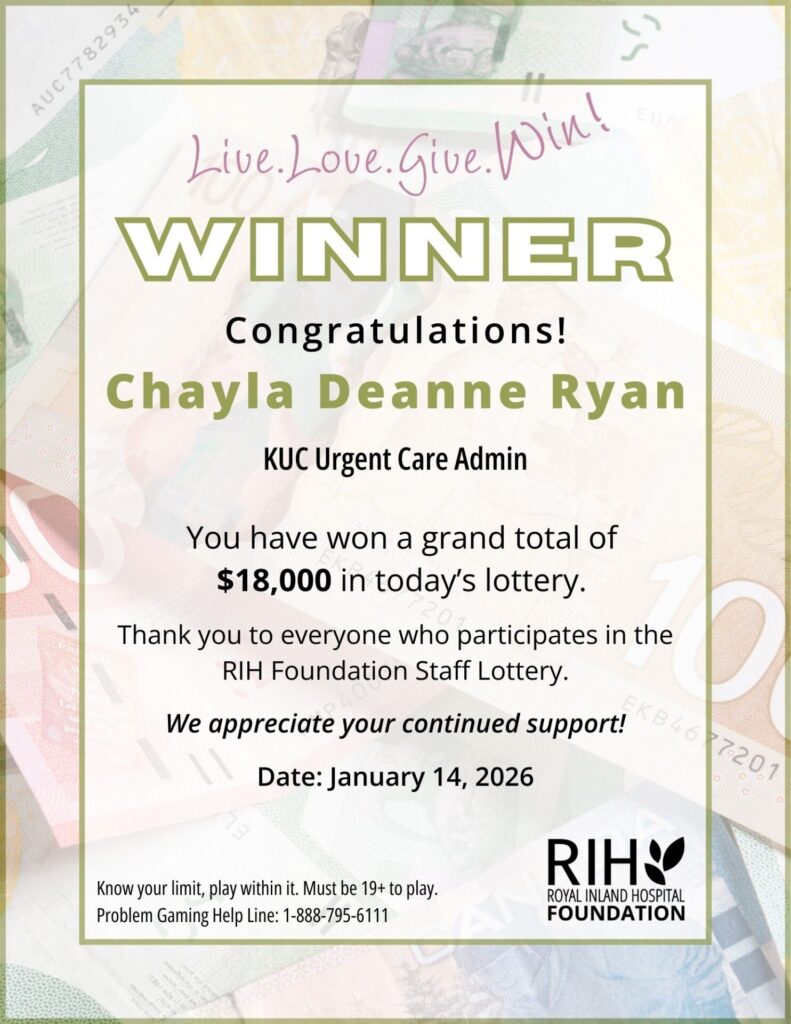 Funds from the Live. Love. Give. WIN! RIH Foundation 50/50 Staff Lottery will be designated for the purchase of patient comforts and equipment at Royal Inland Hospital.